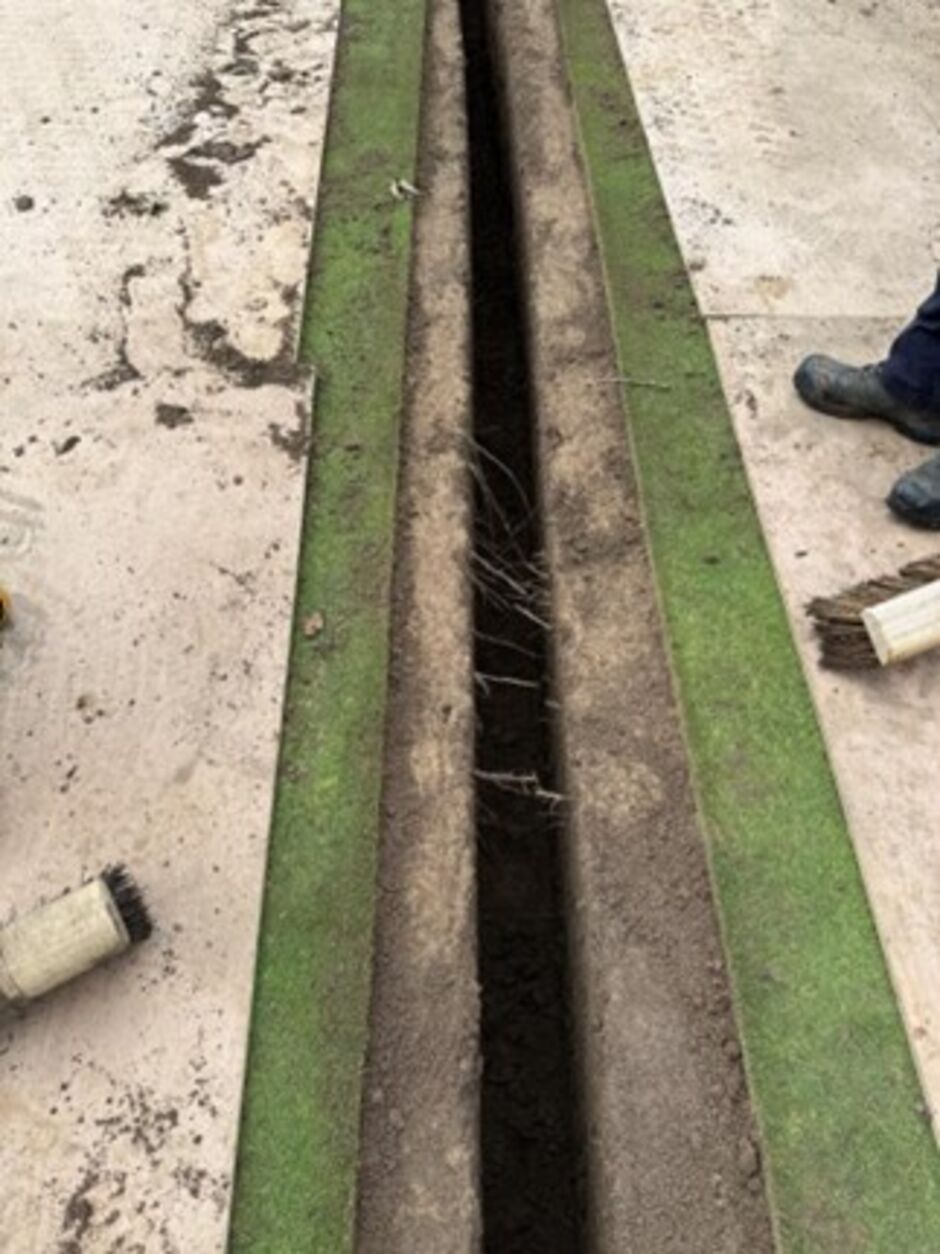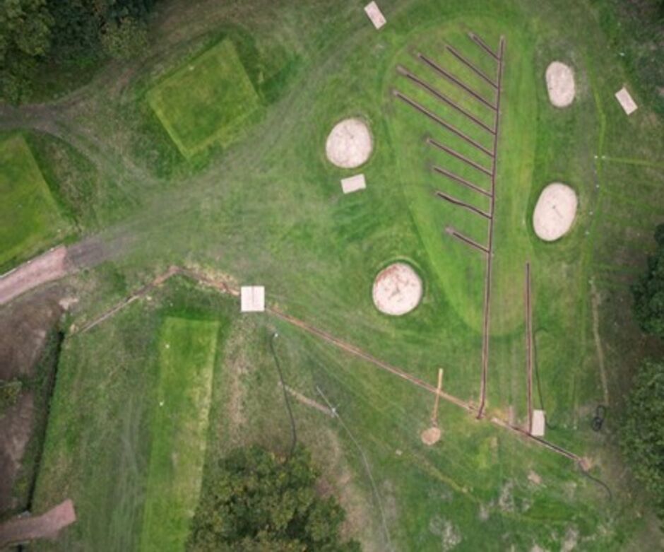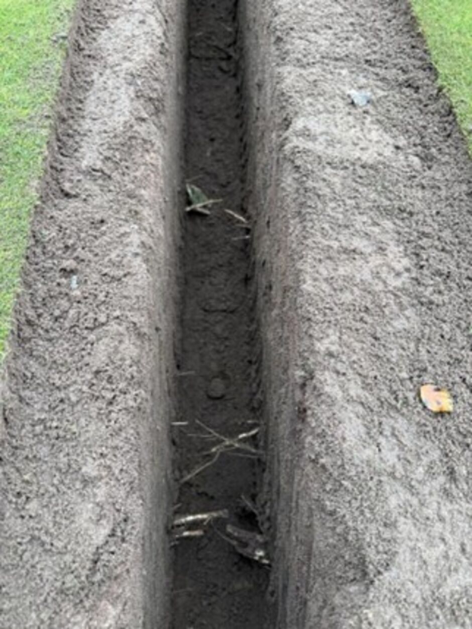 Below is an aerial view of the 15th green with the trenches open, demonstrating where the pipes have been installed: